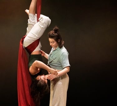 ‘MANDOLIX’ is a movement conversation between Lyre Zachor and Em Duguè. They explore the theme of connection on stage through their practices of aerial silks and floor acrobatics, focusing on the bonds between individuals as well as the relationship between air and ground. Their exploration is rooted in play, a vital element often overlooked in today's society.